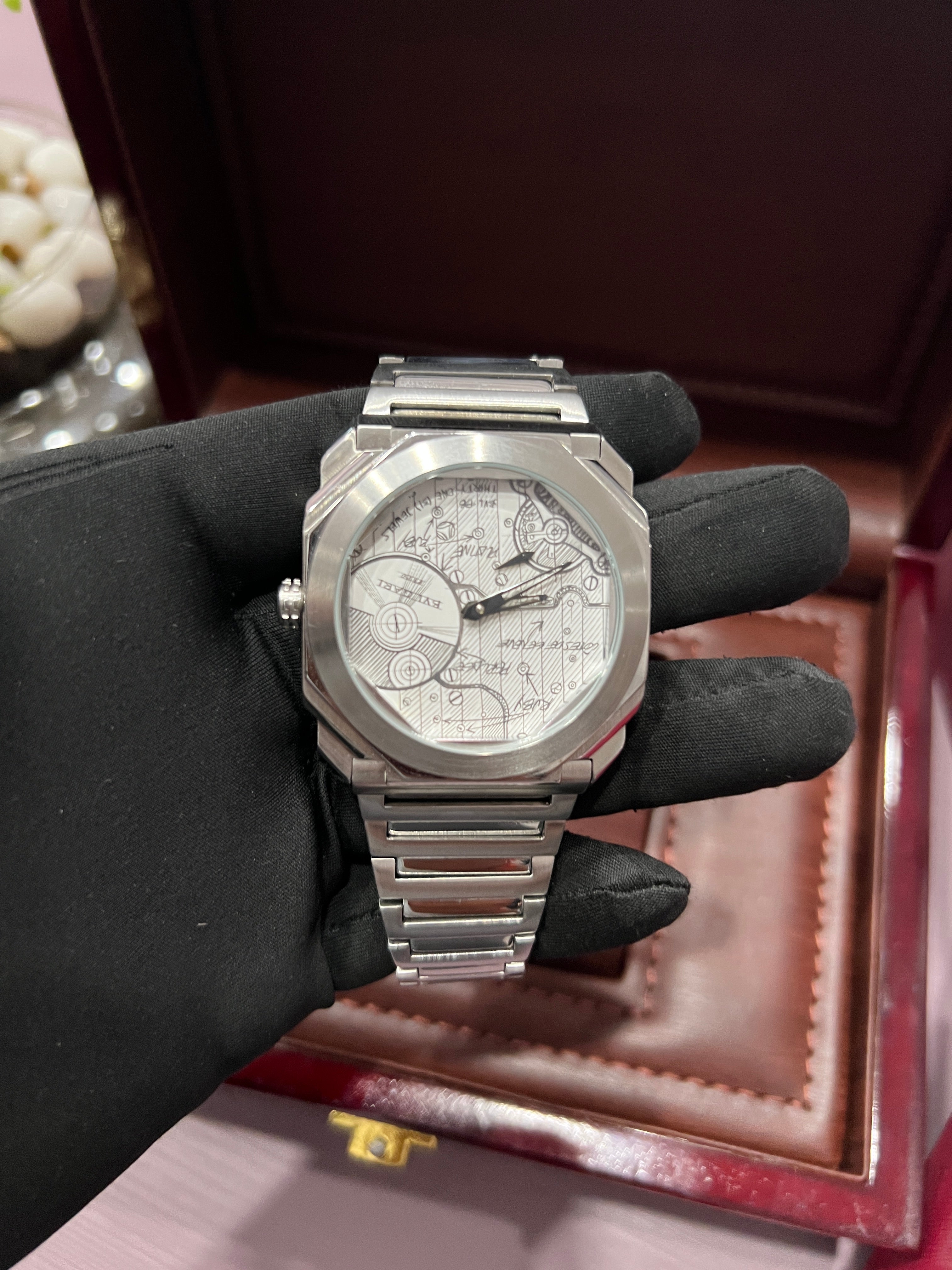 The Bvlgari Octo Finissimo Sketch Limited Edition is a sleek, ultra-thin luxury watch that celebrates innovation, craftsmanship, and artistic expression. Its unique sketch-style dial showcases the original design blueprint of the Octo Finissimo movement, while the open case back reveals the precise and technically brilliant in-house automatic movement. With a sandblasted titanium or stainless steel case and integrated bracelet, this limited-edition timepiece is a fusion of design and mechanical excellence.